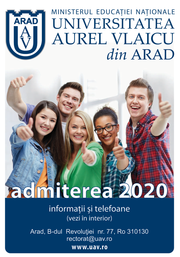 Anul acesta, înscrierea la Universitatea „Aurel Vlaicu” din Arad se va realiza în condiții speciale determinate de epidemia de Coronavirus. Din data de 6 iulie în sediul UAV din Bd. Revoluției nr. 72 (fostul sediul al Băncii Naționale Române) va funcționa un centru unic de înscrieri pentru 8 din cele 9 facultăți ale universității arădene de stat.