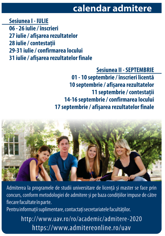 Sesiunea II de înscrieri se desfăşoară la sediul rectoratului UAV din B-dul Revoluției, nr. 77 în perioada 02.09.2019 - 11.09.2019.